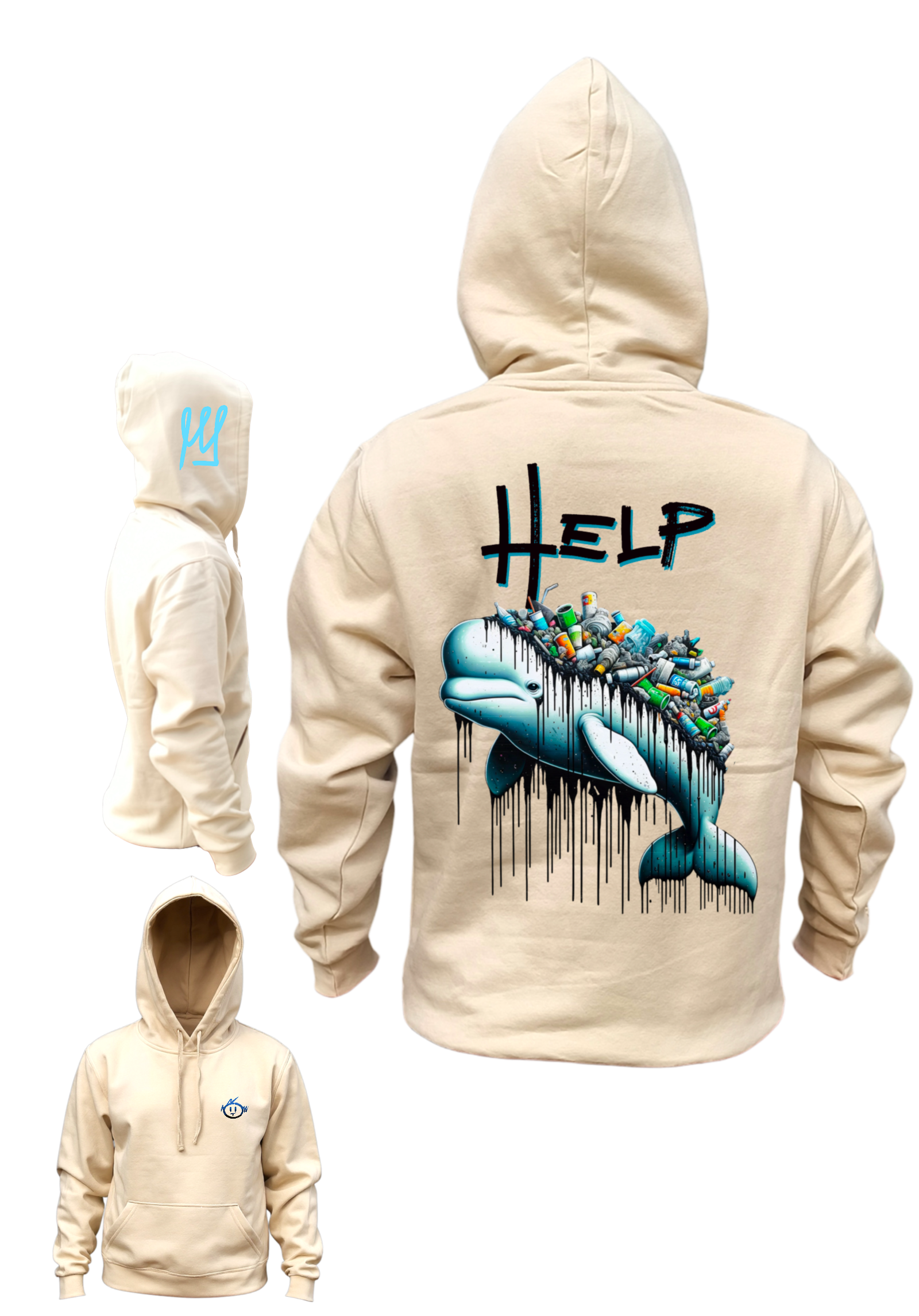 Le hoodie Béluga de la collection Damaged met en scène un colosse marin doux et majestueux, écrasé sous un amas de déchets qui dégoulinent comme une marée artificielle.
