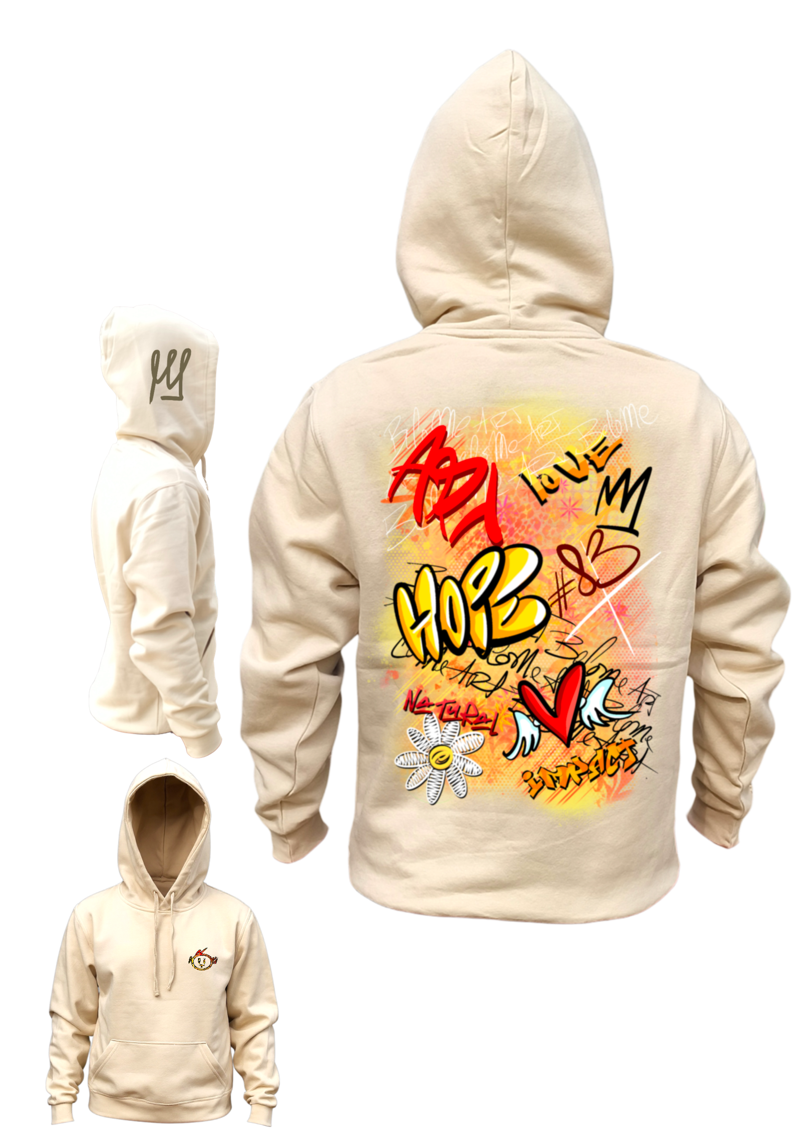Un hoodie qui ressemble à un mur vivant : vibrant, tagué, chuchoté, griffonné… comme si un rayon de lumière avait décidé de faire du street-art.
