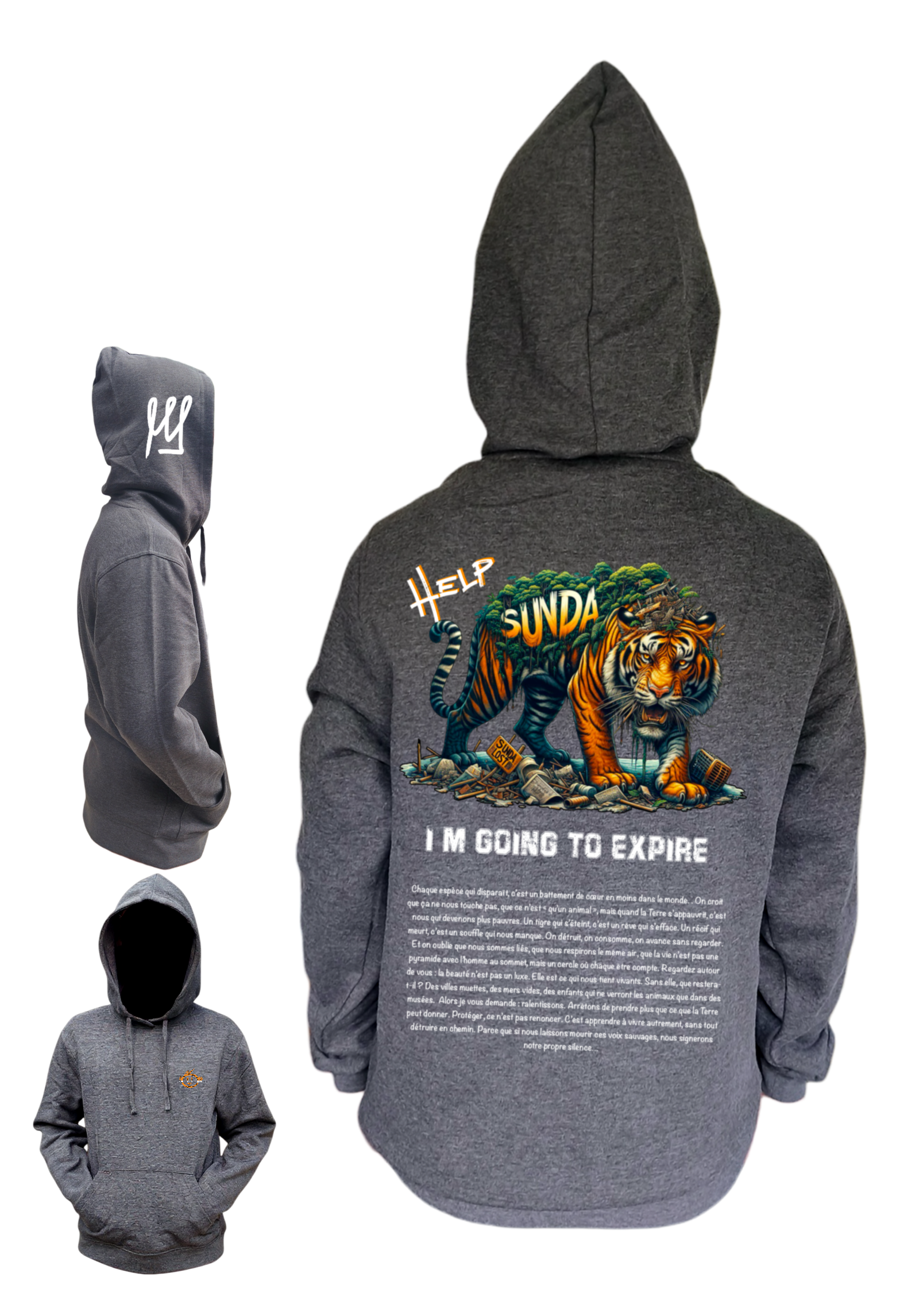 Hoodie Tiger – Collection Damaged. Illustration engagée imprimée en France, coupe unisexe, coton/polyester. Un hommage puissant aux espèces menacées.