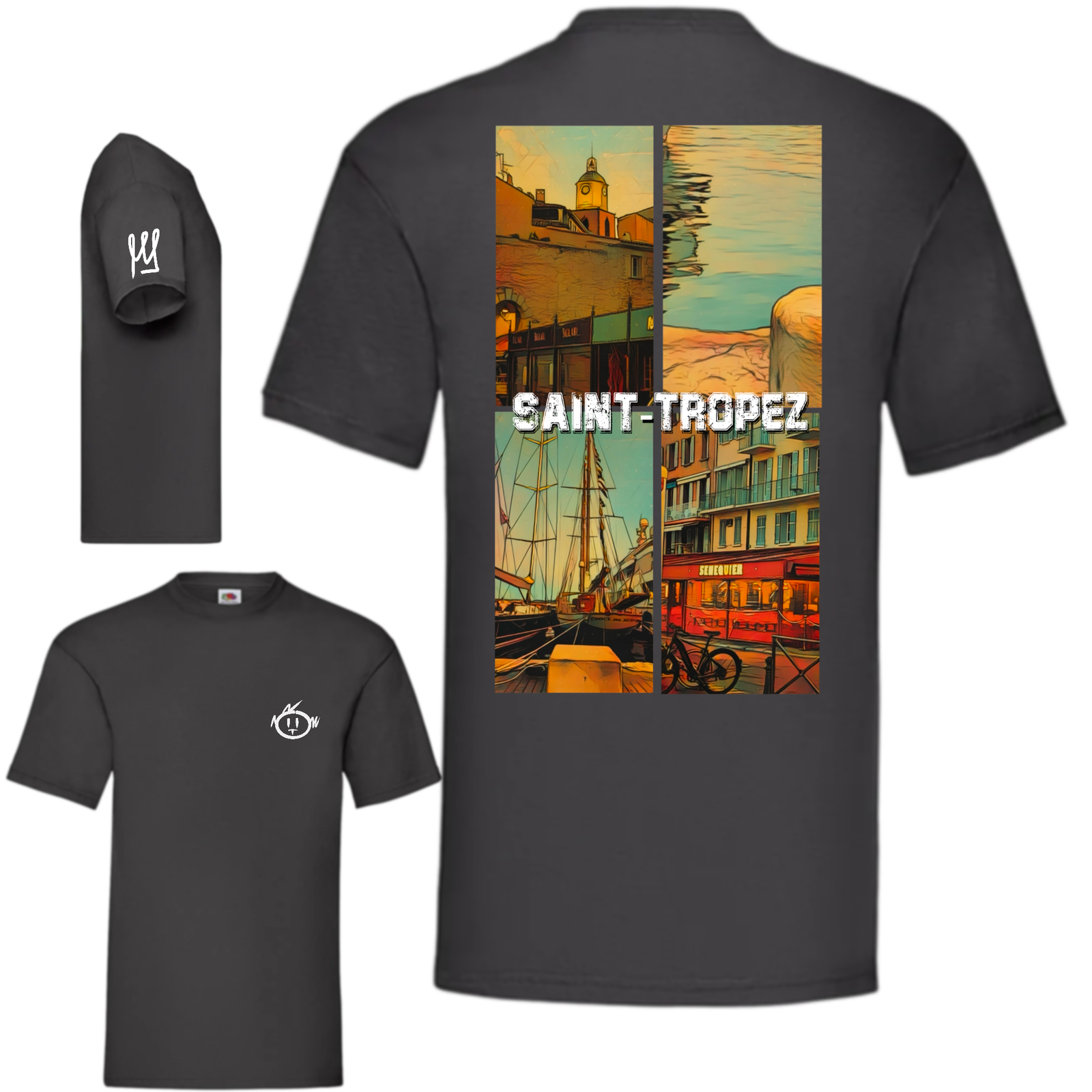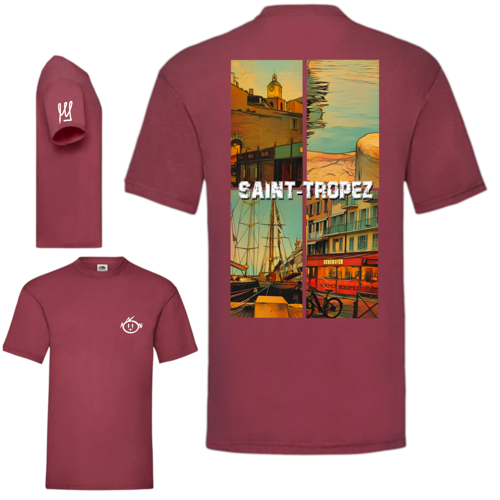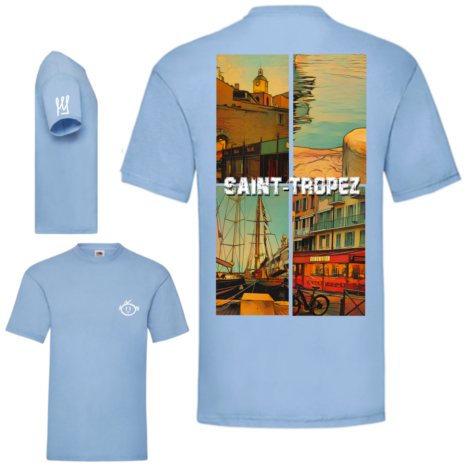 Le t-shirt “Panorama” capture l’essence même du mythe tropézien : le port vibrant, le clocher qui veille,